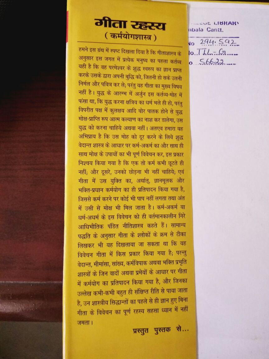 हमने इस ग्रन्थ में स्पष्ट दिखा दिया है कि गीताशास्त्र के अनुसार इस जगत में प्रत्येक मनुष्य का पहला कर्त्तव्य ये ही है कि वह ईश्वर के शुद्ध स्वरूप का ज्ञान प्राप्त करके उसके द्वारा अपनी बुद्धि को जितना हो सके निर्मल और पवित्र कर ले। परन्तु यह गीता का मुख्या विषय नहीं है। युद्ध के आरम्भ में अर्जुन इस कर्त्तव्य मोह में फसा था कि युद्ध करना क्षत्रिय का धर्म भले ही है परन्तु विपरीत पक्ष में कुलक्षय आदि घोर पातक होने से युद्ध मोक्ष-प्राप्ति रूप आत्म कल्याण का नाश कर डालेगा। उस युद्ध को करना चाहिए अथवा नहीं। अतएवं हमारा यह अभिप्राय है कि उस मोह को दूर करने के लिए शुद्ध वेदांत शास्त्र के आधार पर कर्म – अकरम का और साथ ही मोक्ष के उपायों का भी पूर्ण विवेचन कर इस प्रकार निश्चय किया गया है कि एक तो कर्म कभी छूटते ही नहीं ऑन न ही उन्हें छोड़ना चाहिए। अतयं गीता में उस युक्ति का अर्ताथ ज्ञान मूलक और भक्ति प्रधान कर्मयोग का ही प्रतिपादन किया गया है।