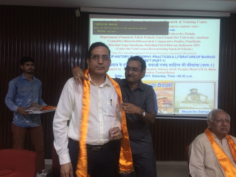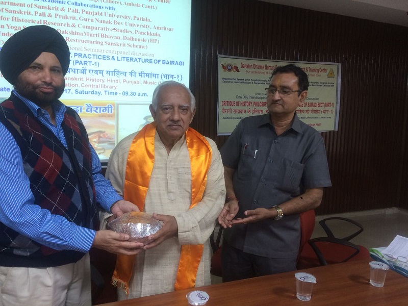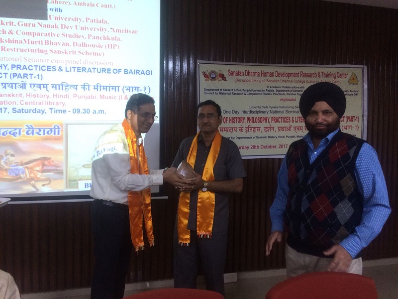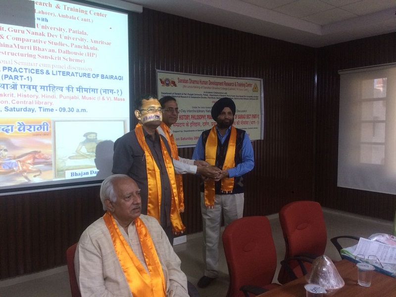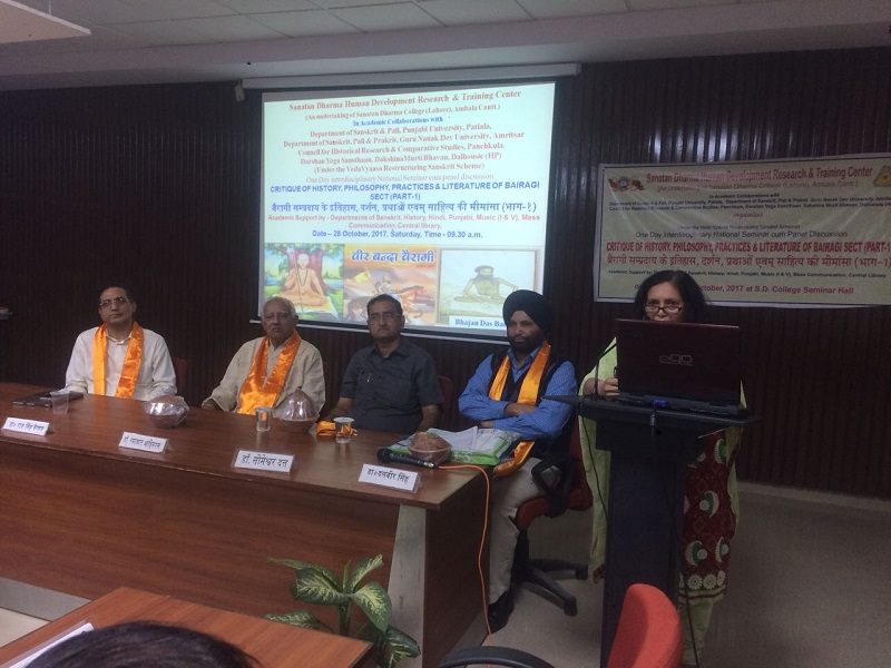 28 अक्टूबर, 2017 को सनातन धर्म मानव विकास शोध एवम् प्रशिक्षण केन्द्र की ओर से अम्बाला छावनी के सनातन धर्म महाविद्यालय के संगोष्ठी कक्ष में “ बैरागी सम्प्रदाय के इतिहास्, दर्शन, प्रथाओं एवम् साहित्य की मीमांसा (भाग 1)” “ Critique of history, philosophy, practices & literature of Bairagi sect (Part-1)” विषय् पर निकटस्थ एवं दूरस्थ विद्वन्मण्डली, प्राध्यापक, शोधार्थी, विद्यार्थी सम्मिलित हुए। बैरागी सम्प्रदाय आज भी जीवन्त एवम् सक्रिय है तथा विभिन्न गतिविधियों के द्वारा समाज कल्याण से जुड़ा हुआ है परन्तु आज भी जन सामान्य में जिस प्राकार इसका प्रचार –प्रसार होना चाहिए, वैसा नहीं हो रहा, इसीलिए बैरागी सम्प्रदाय की दीर्घ परम्परावलियों को एक दिवसीय संगोष्ठी में समेटना दुष्कर कार्य है, अतः इस विषय पर गहन विचार करने के लिए संगोष्ठी भाग दो की पूरी सम्भावना एवं चुनौति रहेगी। इस संगोष्ठी में पंजाब विश्वविद्यालय के भूतपूर्व संस्कृत विभागाध्यक्ष प्रो० रमाकान्त आंगिरस, बन्दा बैरागी परम्परा से साक्षात् एवं सक्रिय रूप से सम्बद्ध डा० राजसिंह वैष्णव, पञ्चकूला में स्थित ऐतिहासिक शोध एवम् तुलनात्मक अध्ययन परिषद् के निदेशक श्री नीरज अत्रि, पञ्चकूला में स्थित हरियाणा ग्रन्थ अकादमी के उपाध्यक्ष डा० वीरेन्द्र चौहान, अखिल भारतीय बैरागी सम्प्रदाय के अध्यक्ष श्री कृष्ण कुमार बावा जैसे अनुभव-वृद्ध एवम् ज्ञानवृद्ध विद्वन्मण्डली ने बैरागी सम्प्रदाय की मूल पृष्ठभूमी का परिचय देते हुए महन्तों एवम् अखाड़ों की जानकारी प्रदान की। संगोष्ठी का मुख्य विचार बिन्दु पर चर्चा करते हुए यह स्पष्ट हुआ कि 1857 की क्रान्ति में सबसे पहले फांसी पर चढ़ने वाले महन्त रामप्रसाद बैरागी थे। बैरागियों का राष्ट्र-प्रेम, समाज सुधार एवम् उनका गम्भीर दर्शन शोध के नए आयाम प्रस्तुत कर रहा है। अतः ओझल होती हुई बैरागी परम्परा को प्रकाश में लाने का श्रेय इस संगोष्ठी को जाता है। इस संगोष्ठी में “सनातन धर्म मानव विकास शोध एवम् प्रशिक्षण केन्द्र” की ओर से जारी होने वाले न्यूज-लैटर का उद्घाटन हरियाणा संस्कृत अकादमी के अध्यक्ष डा० सोमेश्वर दत्त के कर कमलों से किया गया। इस अवसर पर न्यूज-लैटर की सहसम्पादिका प्रो. मीनाक्षी शर्मा ने सम्पादिकाओं डा० उमा शर्मा और डा० दिव्या जैन के साथ मिल कर न्यूज-लैटर का प्रारूप प्रस्तुत किया। इसी संगोष्टी अम्बाला छावनी स्थित सनातन धर्म संस्कृत कालेज के प्रध्यापक डा० नरेश बत्रा द्वारा लिखित “ वृत्तं यथावृत्तमिदं मदीयम्” पुस्तक का विमोचन हरियाणा ग्रन्थ अकादमी, पञ्चकूला के अध्यक्ष डा० वीरेन्द्र चौहान के करकमलों से हुआ। सम्गोष्ठी में हरियाणा के अतिरिक्त हिमाचल, नासिक, जैसलमेर, पञ्जाब, उत्तरप्रदेश से आए विद्बानों ने बैरागी सम्प्रदाय पर 