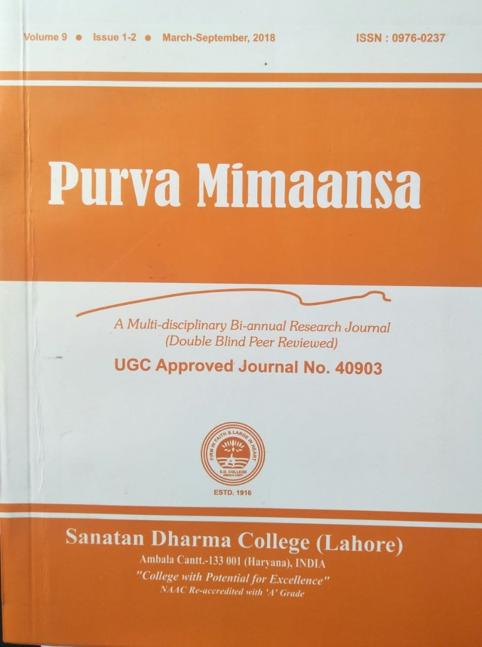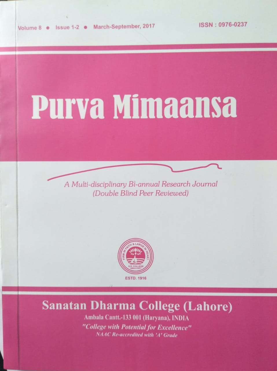 It’s matter of satisfaction for S D College, Ambala Cantt that the Bi-annual Interdisciplinary Research Journal- PURVA-MIMAANSAA पूर्व मीमांसा has received impact factor 3.765.