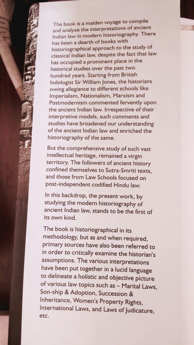 The book is a maiden voyage to compile and analyze the interpretations of ancient Indian law in modern historiography. There has been a dearth of books with historiographical approach to the study of classical Indian law, despite the fact that law has occupied a prominent place in the historical studies over the past two hundred years. Starting from British ideologist Sir Williom Jones, the historian owing allegiance to different school like Imperialism, Nationalism, Marxism and postmodernism commented fervently upon the ancient Indian law. Irrespective of their interpretive models, such comments and studies have broadened our understanding of the ancient Indian law and enriched the historiography of the same.