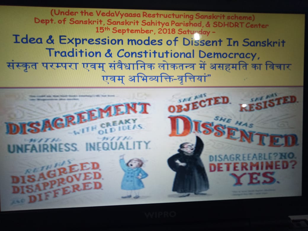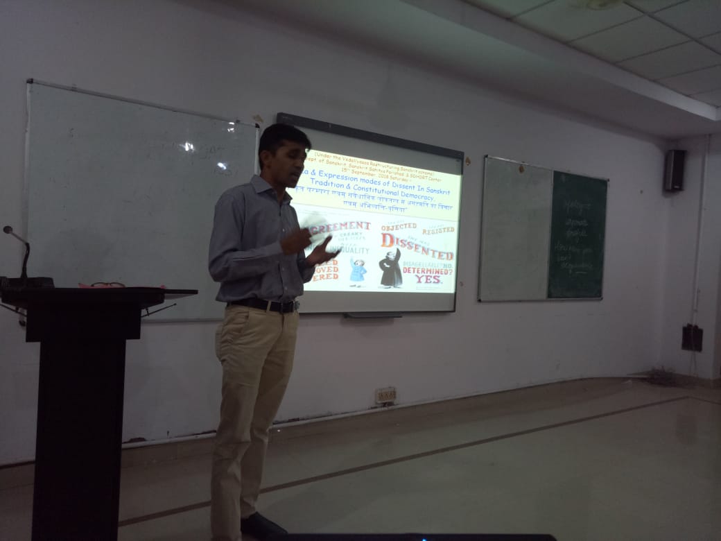 Dept. of Skt introduced the idea of dissent in sanskrit Tradition with help of ppt and explained the meaning and modes of expression of dissent in indian tradition. Dr Chiman lal explained article 19 of constitution in detail & also explained the culture of freedom and responsibility along with the purpose of political dissent. Questions were raised by students about the media generated dissent, behaviour of parliamentarians etc. Dr Someshwar dutt in his address talked about the emerging trends of dissent and the kind of language being used for it. Dr Uma Sharma proposed the vote of thanx after explaining the context of freedom to dissent.